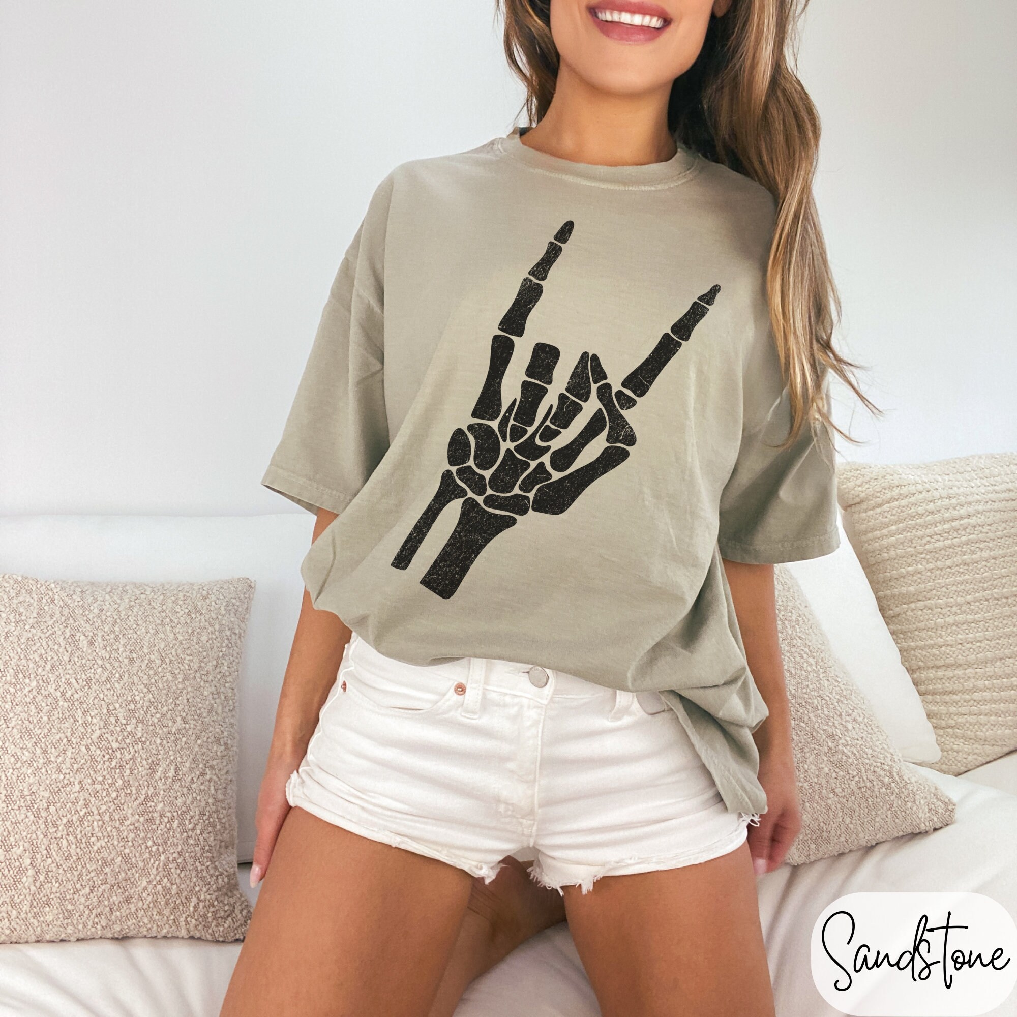Skeleton Hand Rock On Graphic Tee - Retro Skull Oversized T-Shirt