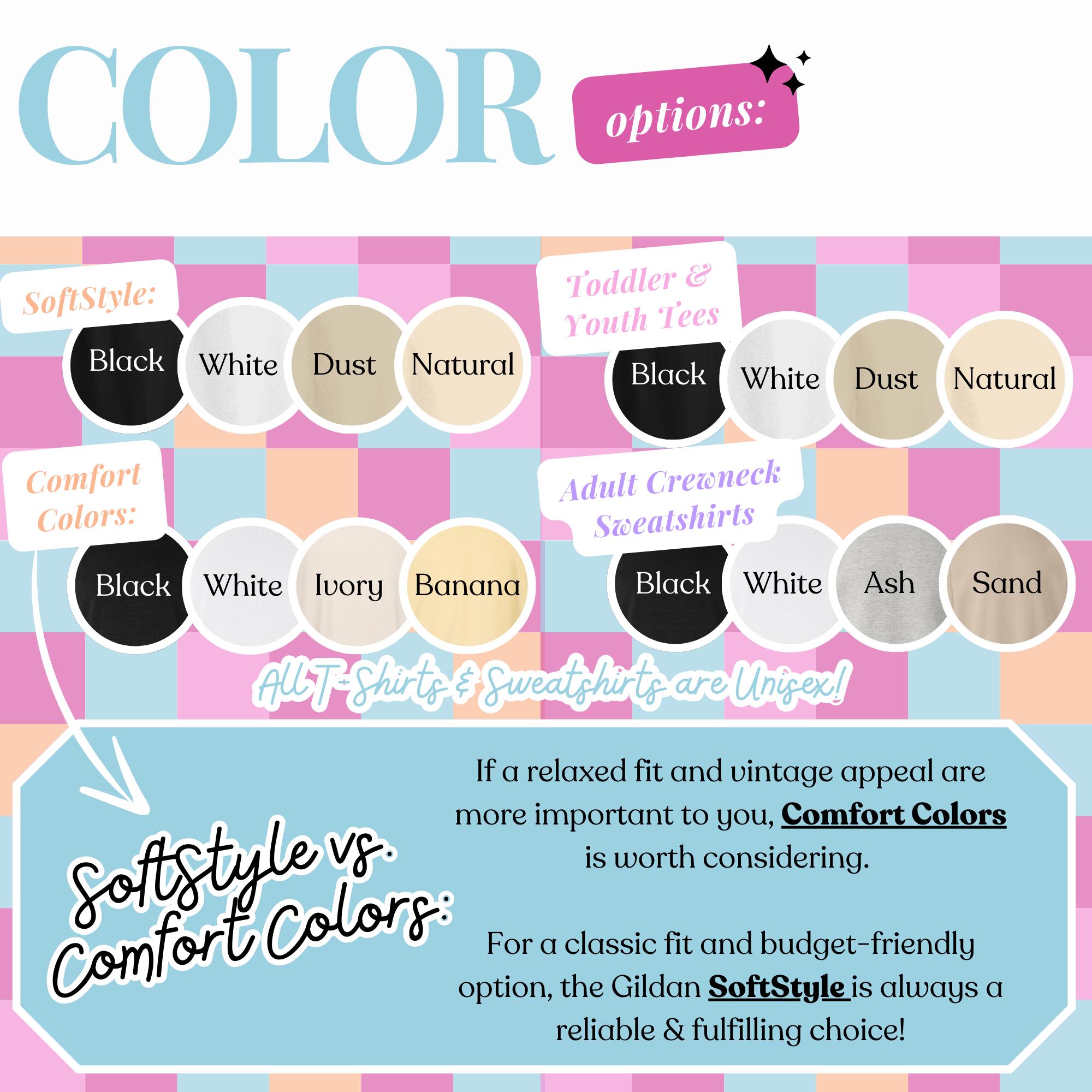* Choose between a Comfort Colors tee, Softstyle tee, crewneck sweatshirt, or get one for the kids!