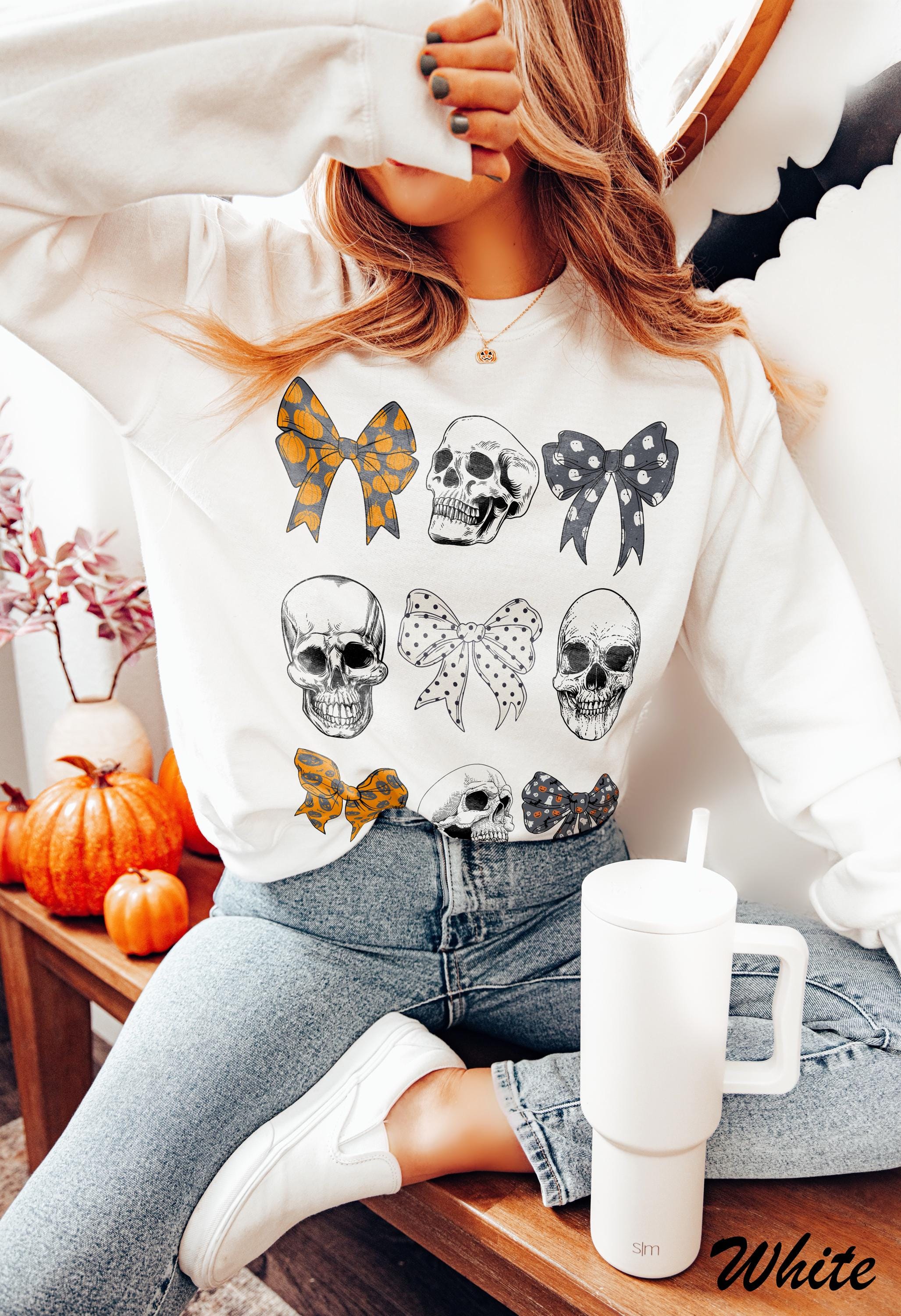 -- All orders submitted AFTER December 13th cannot be guaranteed to be delivered before Christmas. Halloween Shirts, Skeleton Skull Black Bow Sweatshirt, Retro Halloween Shirt, Halloween Women's, Costume, Fall Sweater, Spooky Season
