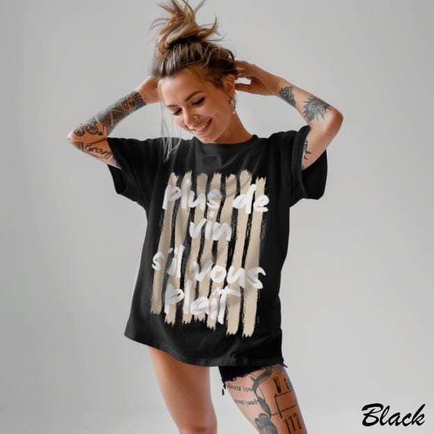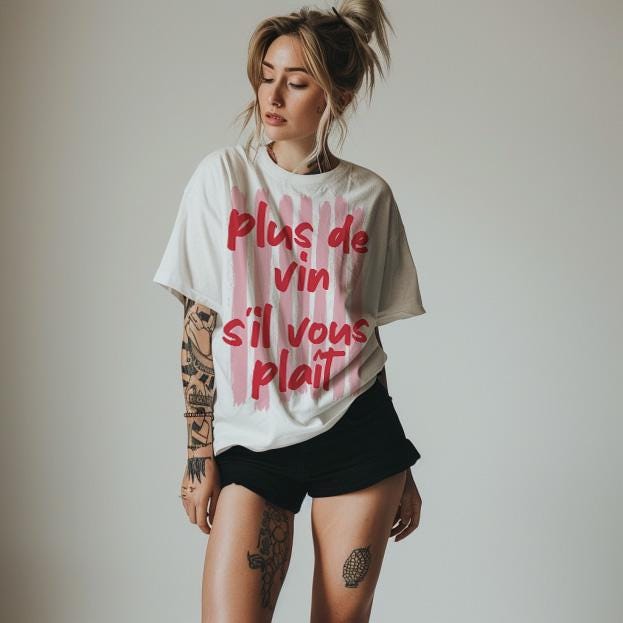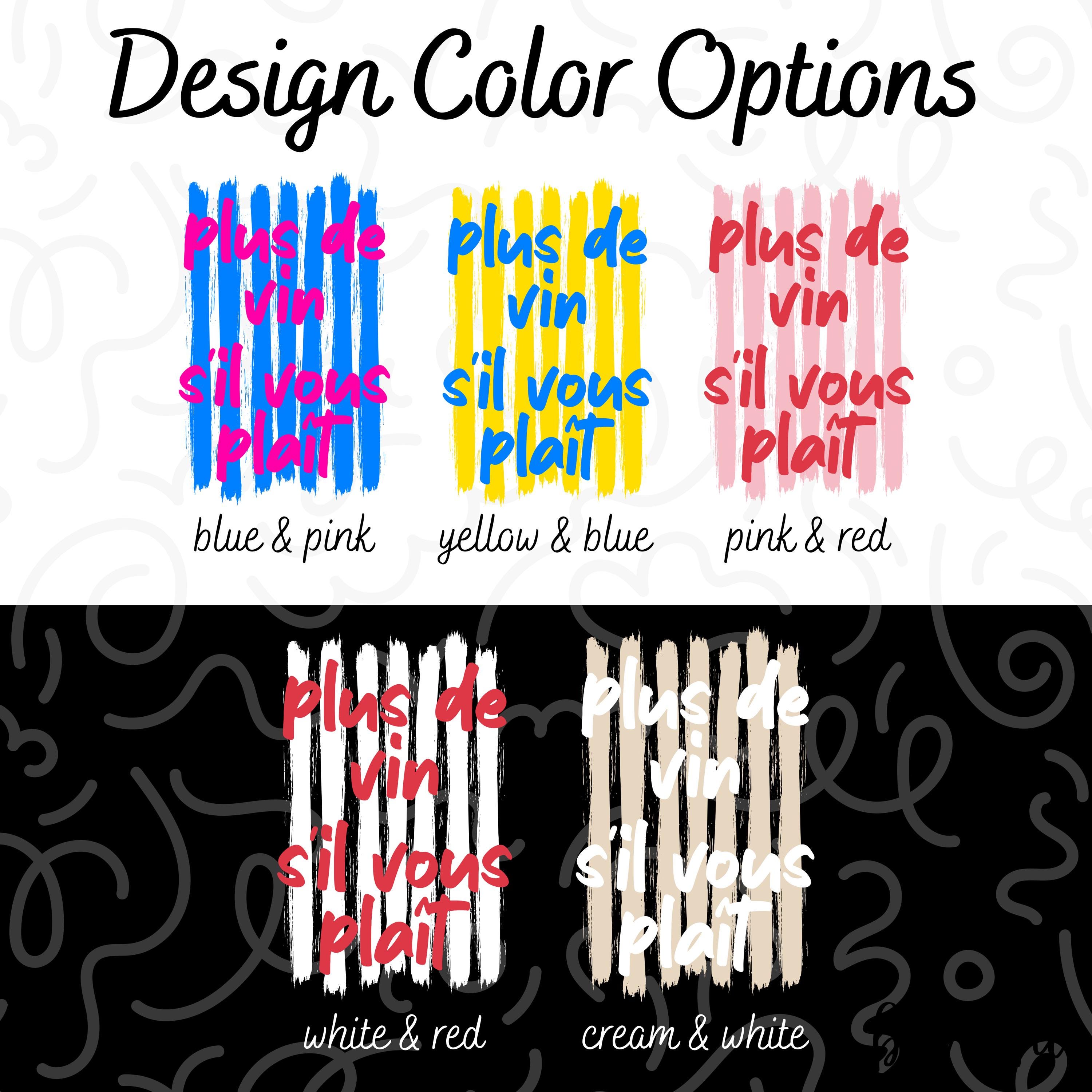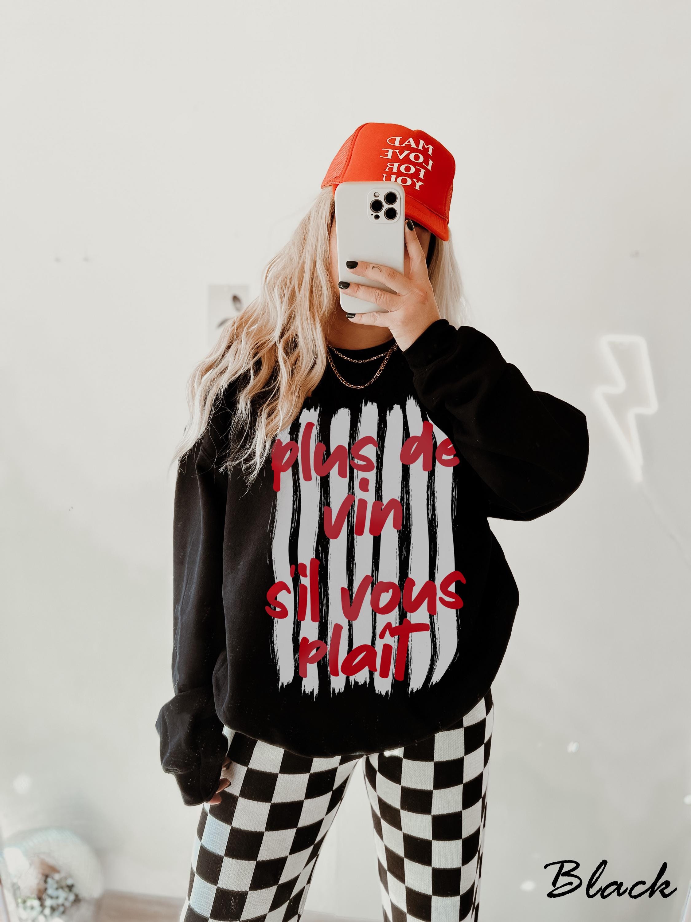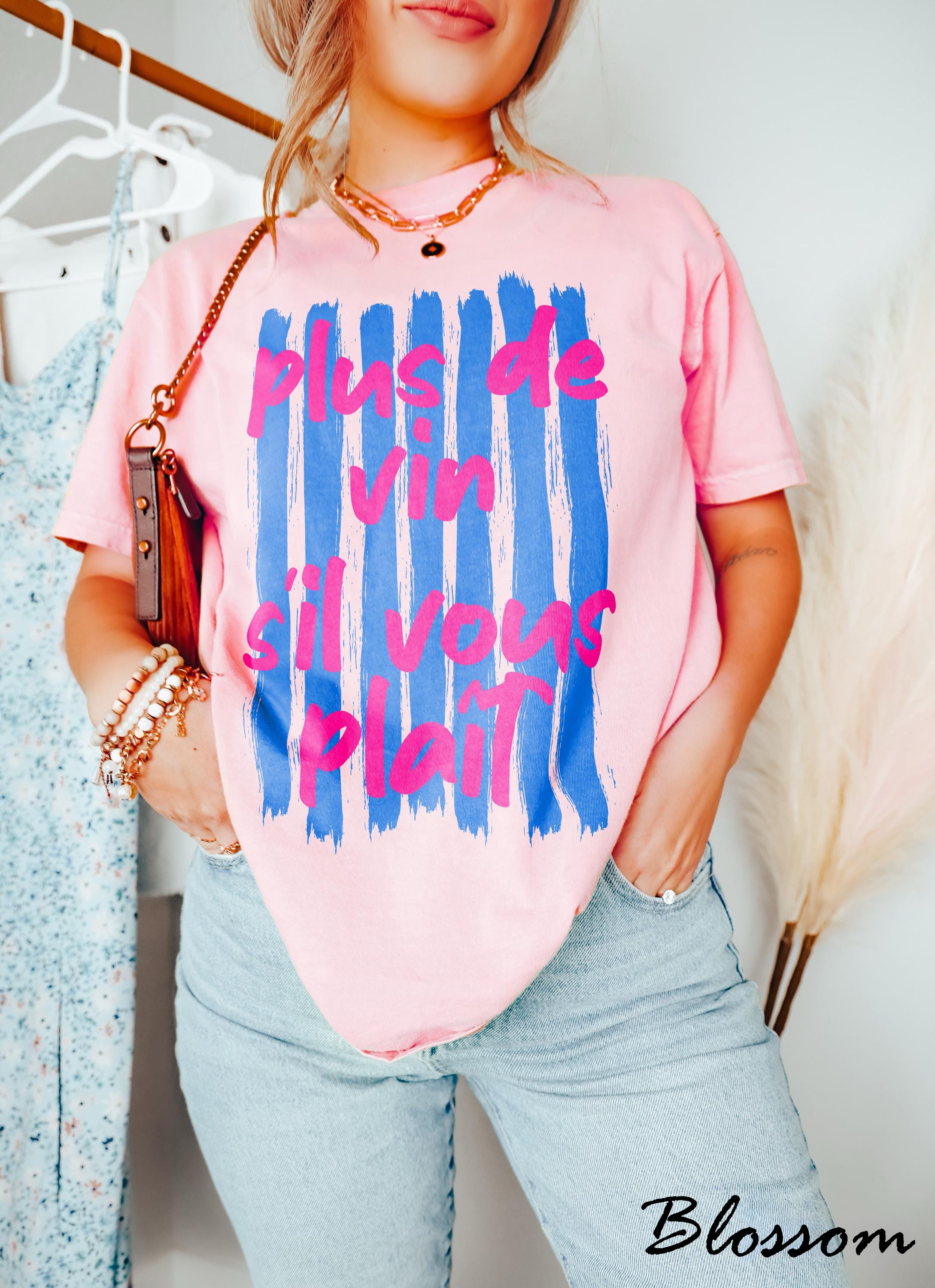 Add a splash of sass to your wardrobe with our “Plus de vin s’il vous plaît” (“More wine please”) graphic tee — the perfect blend of French flair and wine-loving attitude! This fun and flirty design is available in five different design colors, on your favorite Comfort Colors 1717 or Gildan Softstyle 64000 unisex tee. There are 13 tshirt color options!! Whether you're brunching with friends or lounging at home with a glass of Pinot, this shirt delivers wine vibes with a chic twist. Ideal for wine lovers, girls’ trips, or casual gifts — pour more personality into your style today!