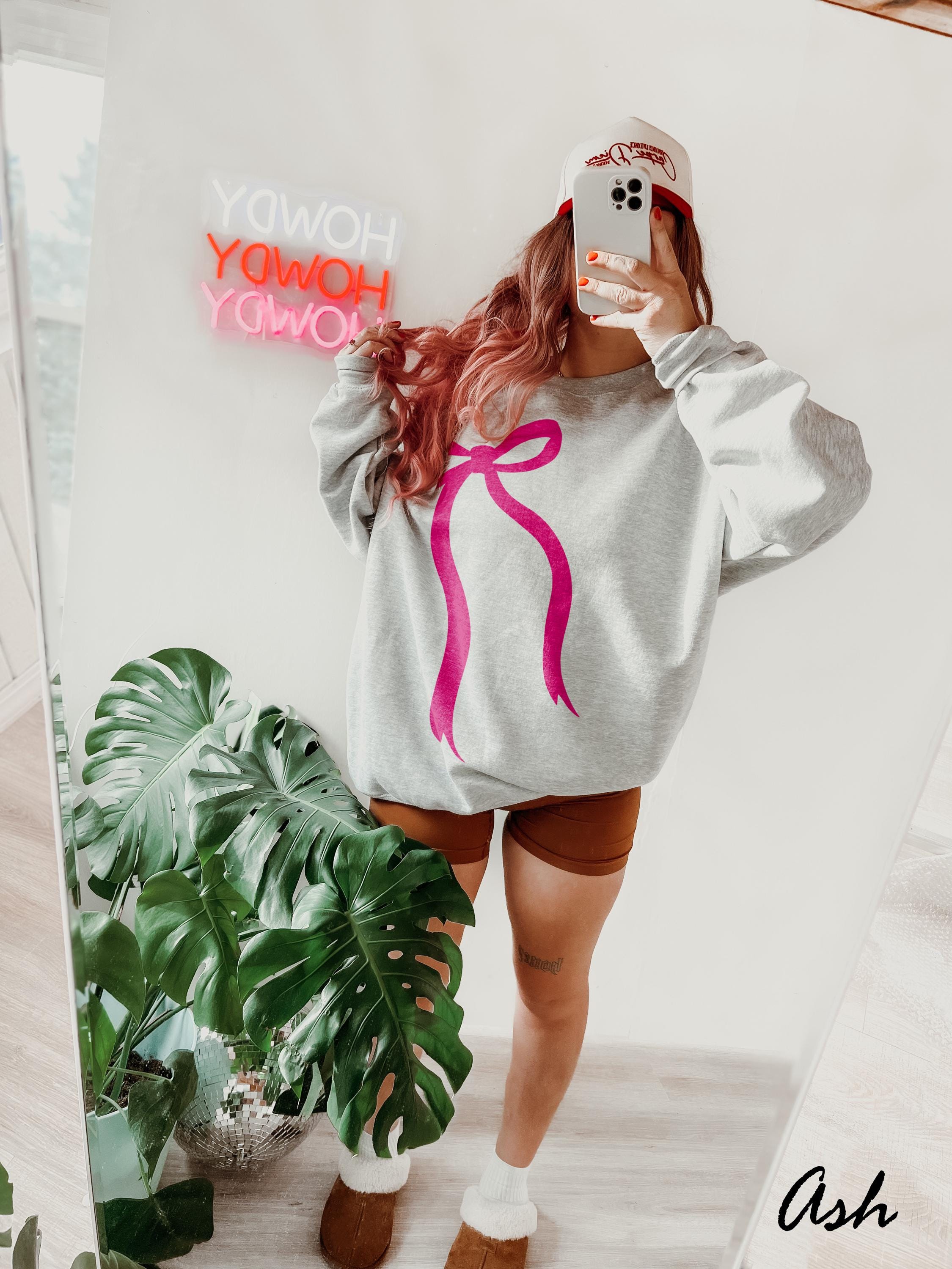 Add a touch of soft girl charm to your wardrobe with this adorable pink bow graphic tee or sweatshirt, perfect for coquette, preppy, and Y2K-inspired outfits. This design features a dainty bow on the front, bringing effortless cuteness to any look — whether you're dressing it up or keeping it casual.
