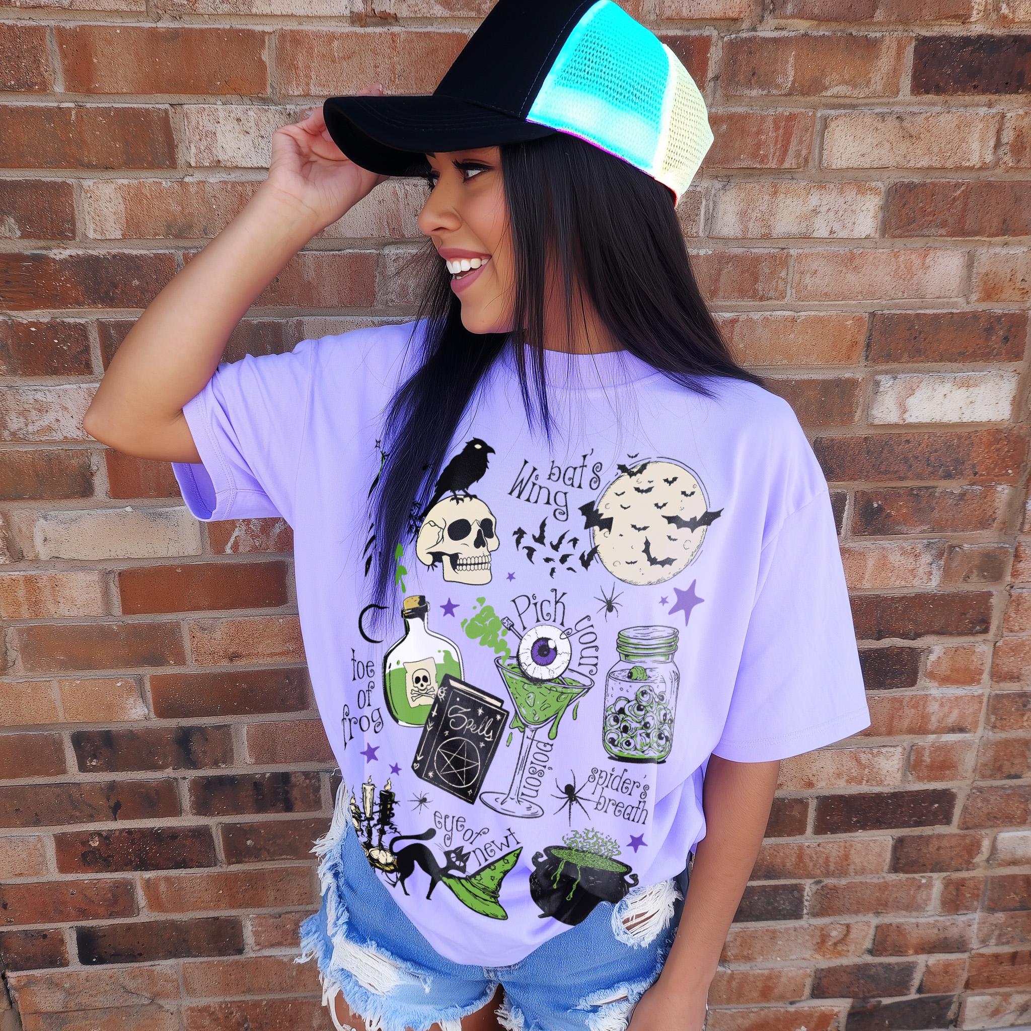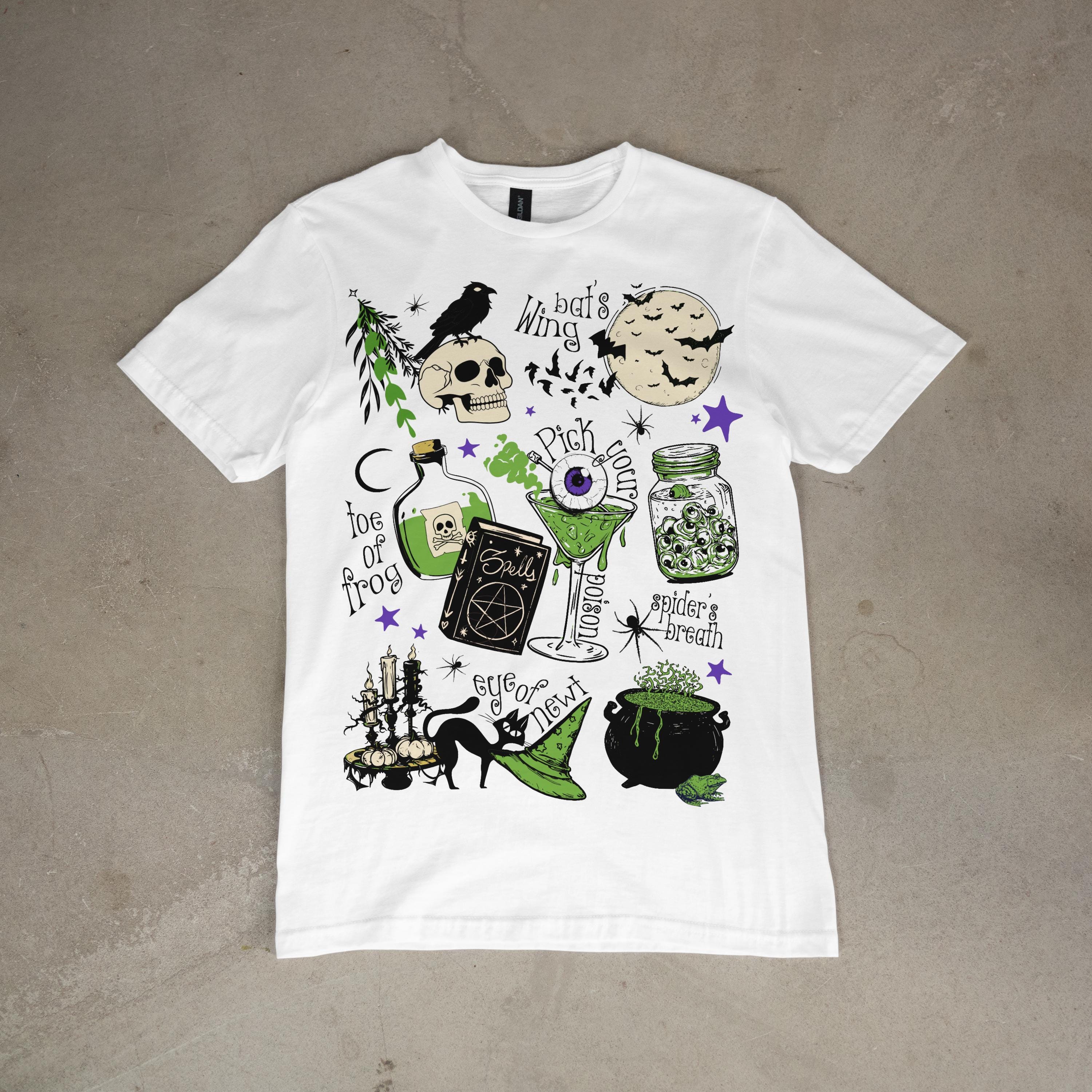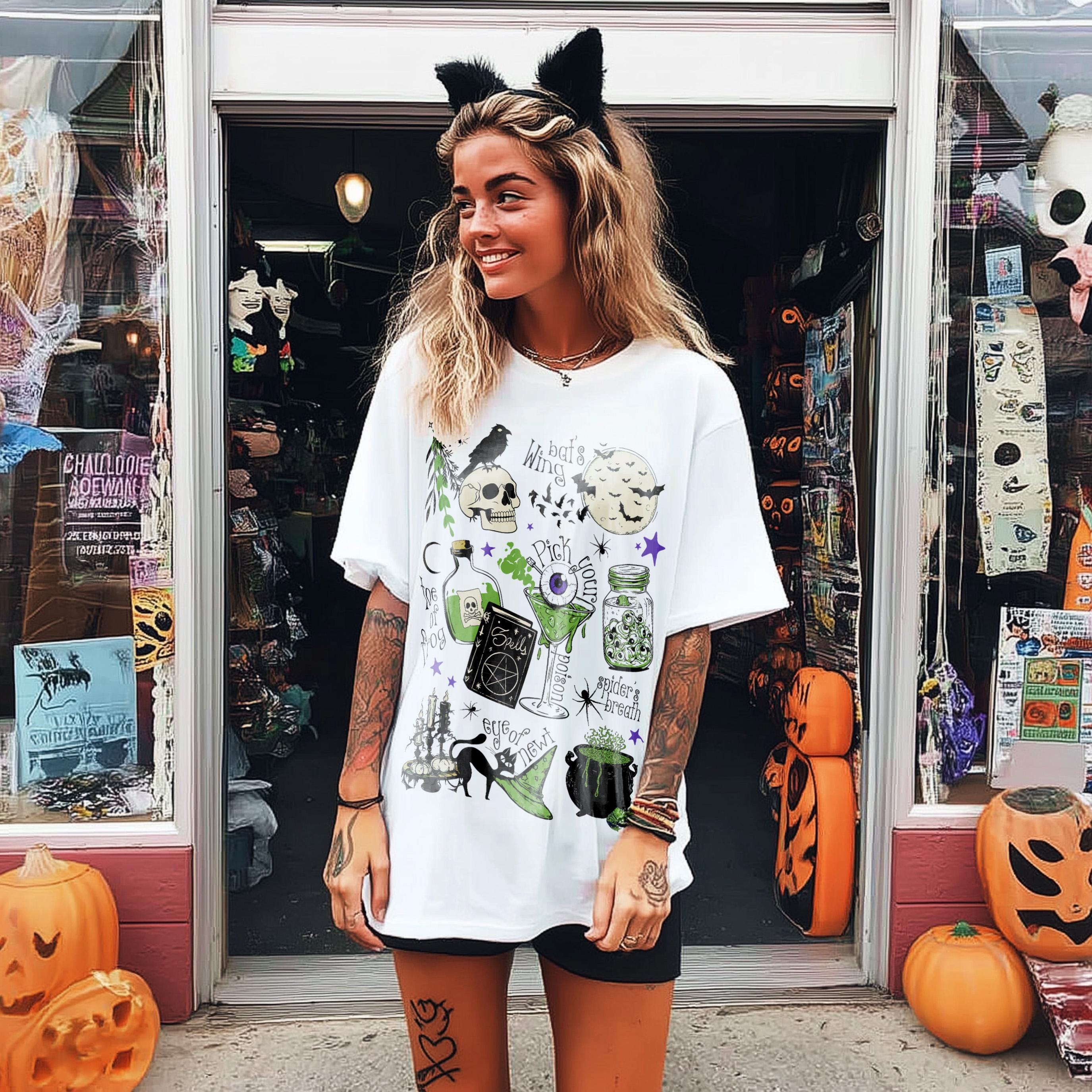 This witchy Halloween Comfort Colors T-Shirt is the perfect mix of spooky and fun, featuring hand-drawn illustrations of a bubbling cauldron, skull, potion bottle, spell book, and creepy details. Whether you’re celebrating Halloween night, heading to a haunted house party, or rocking your year-round witchy vibe, this vintage-inspired graphic tee makes a bold, eye-catching statement.