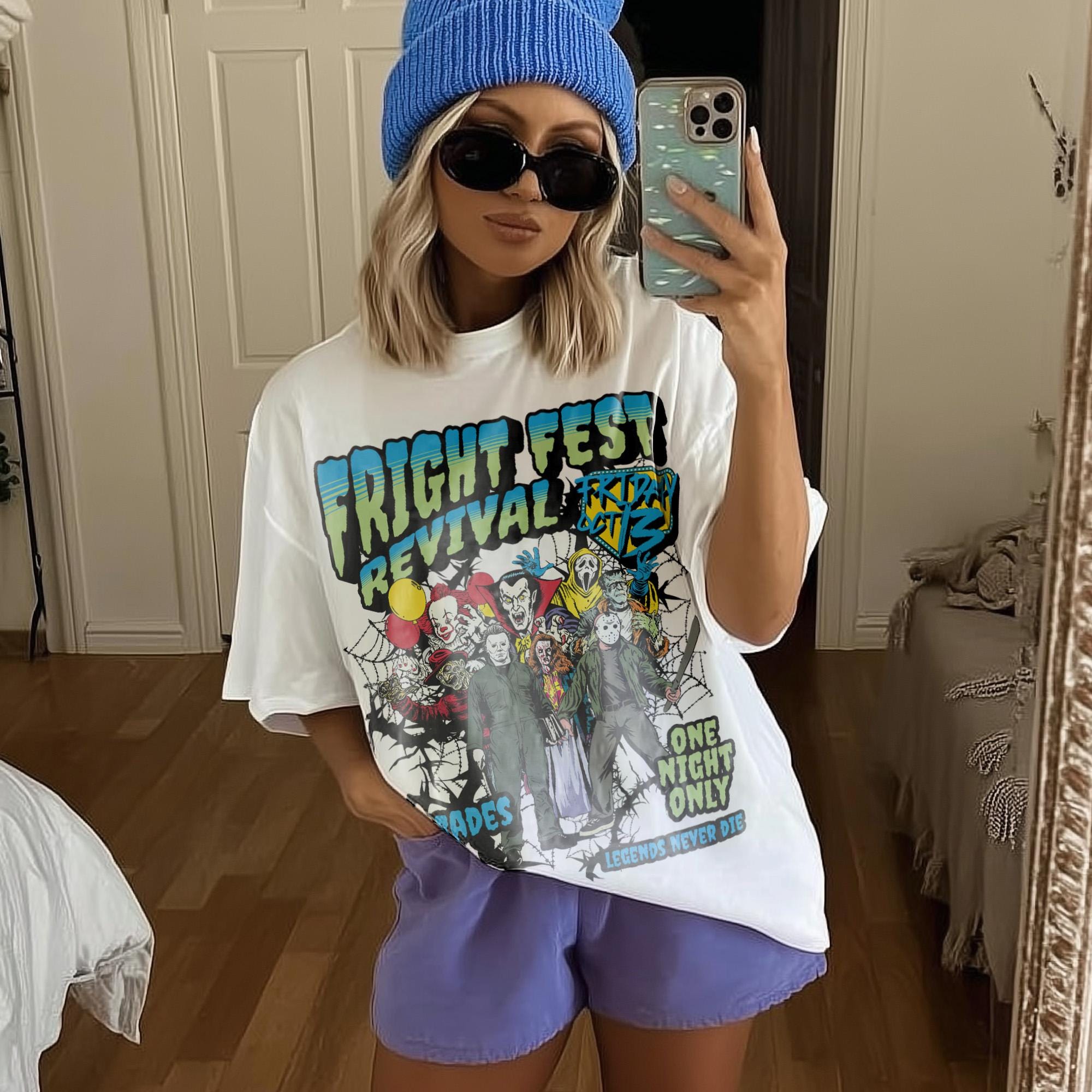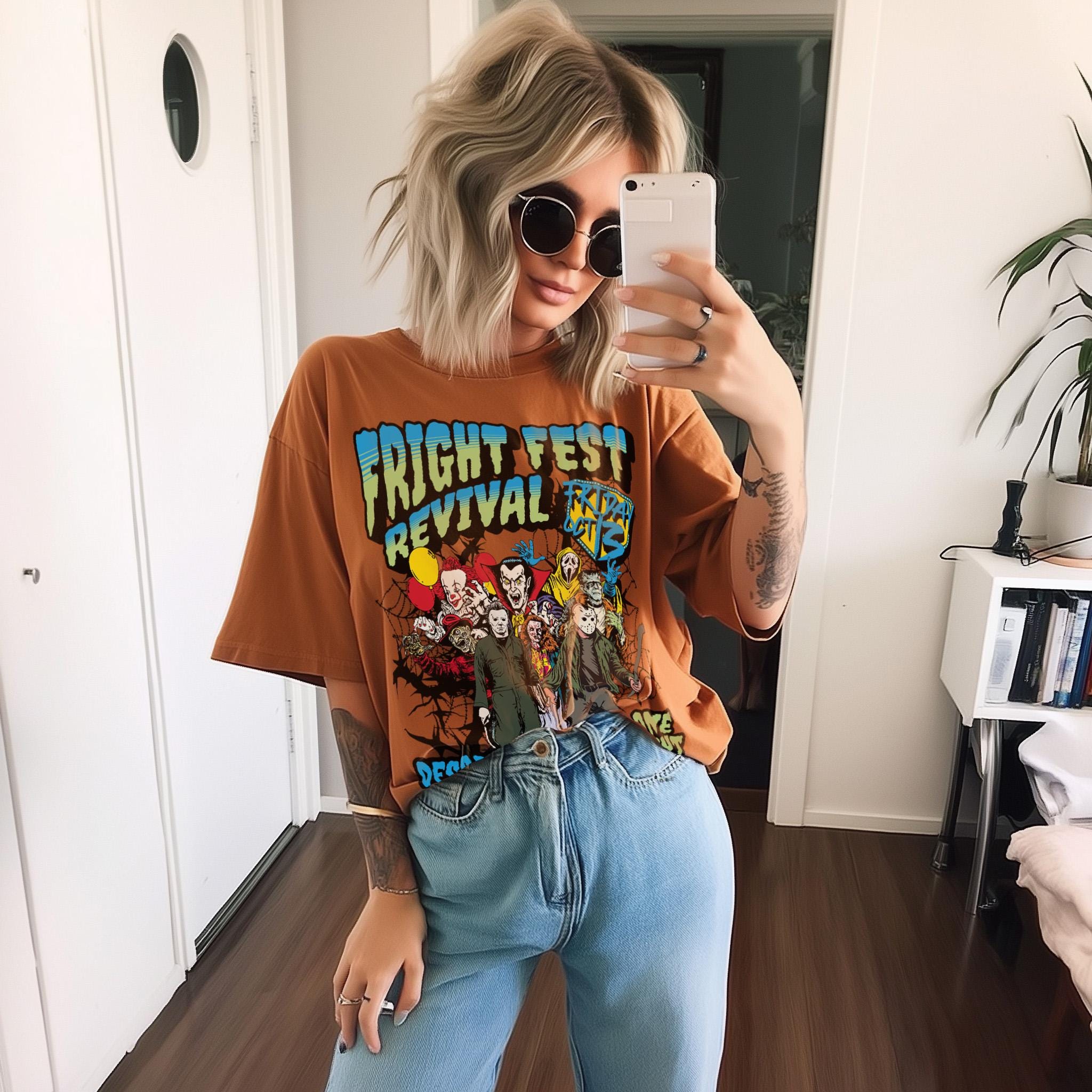 This Fright Fest Revival horror t-shirt is packed with spine-chilling vibes — featuring classic scary movie villains and retro comic-style graphics. Perfect for haunted houses, horror movie marathons, and Halloween parties, this vintage Halloween graphic tee makes a bold statement for any fan of spooky season.