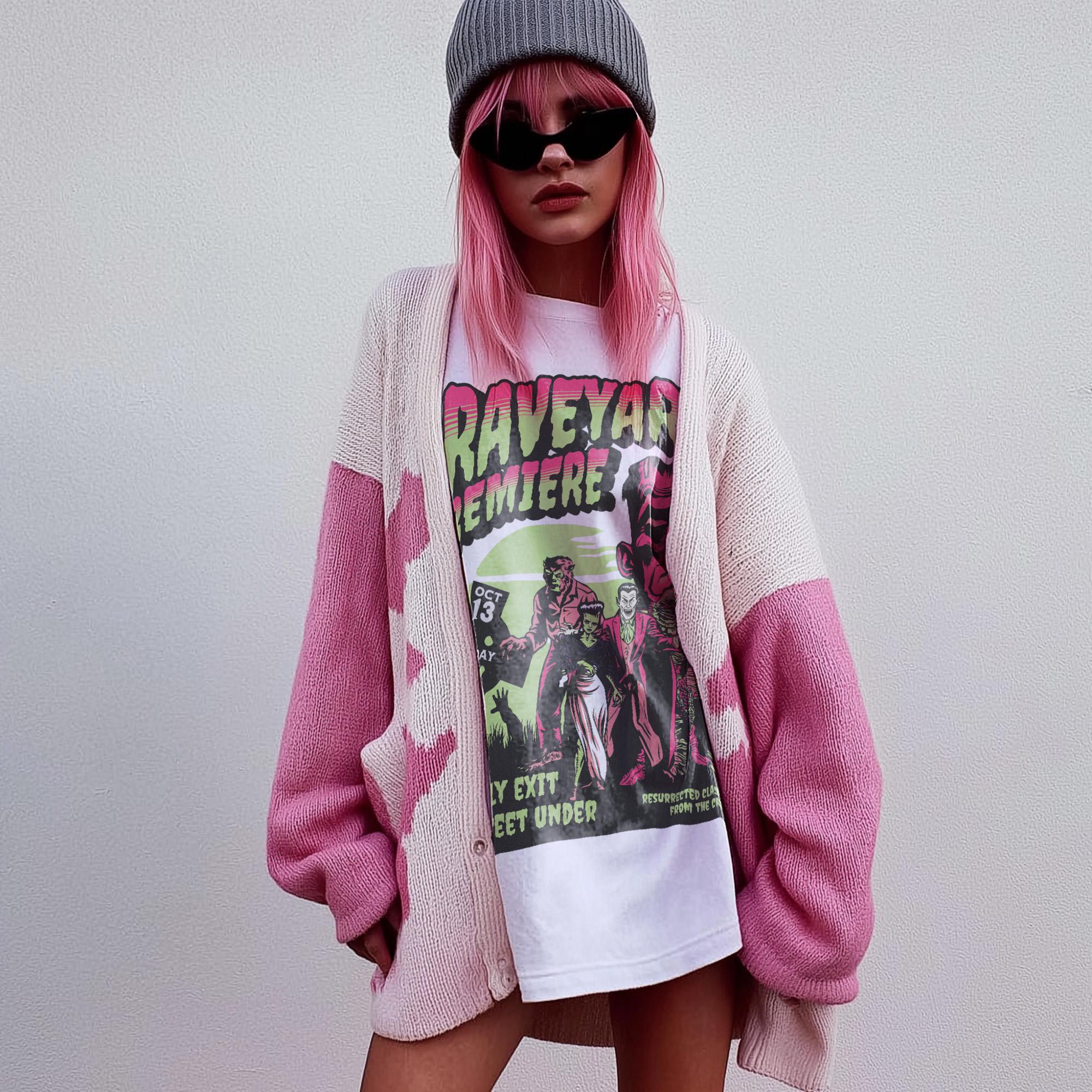 Get ready to resurrect retro horror! This Graveyard Premiere tee brings the classic Universal monsters—Frankenstein, Bride of Frankenstein, Dracula, Wolfman, Creature from the Black Lagoon—back to the grave in a vibrant vintage-style illustration. Bold colors and distressed textures evoke the drive-in horror shows of the 1950s, but the look is pure 90s vintage revival perfected for Halloween season and year-round monster mania.