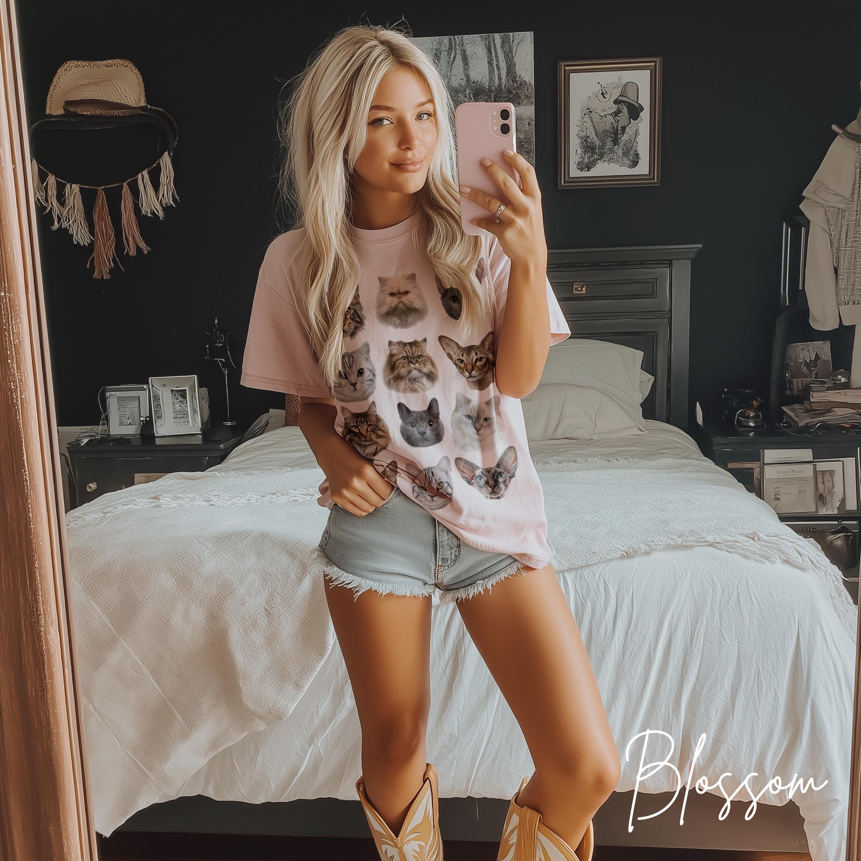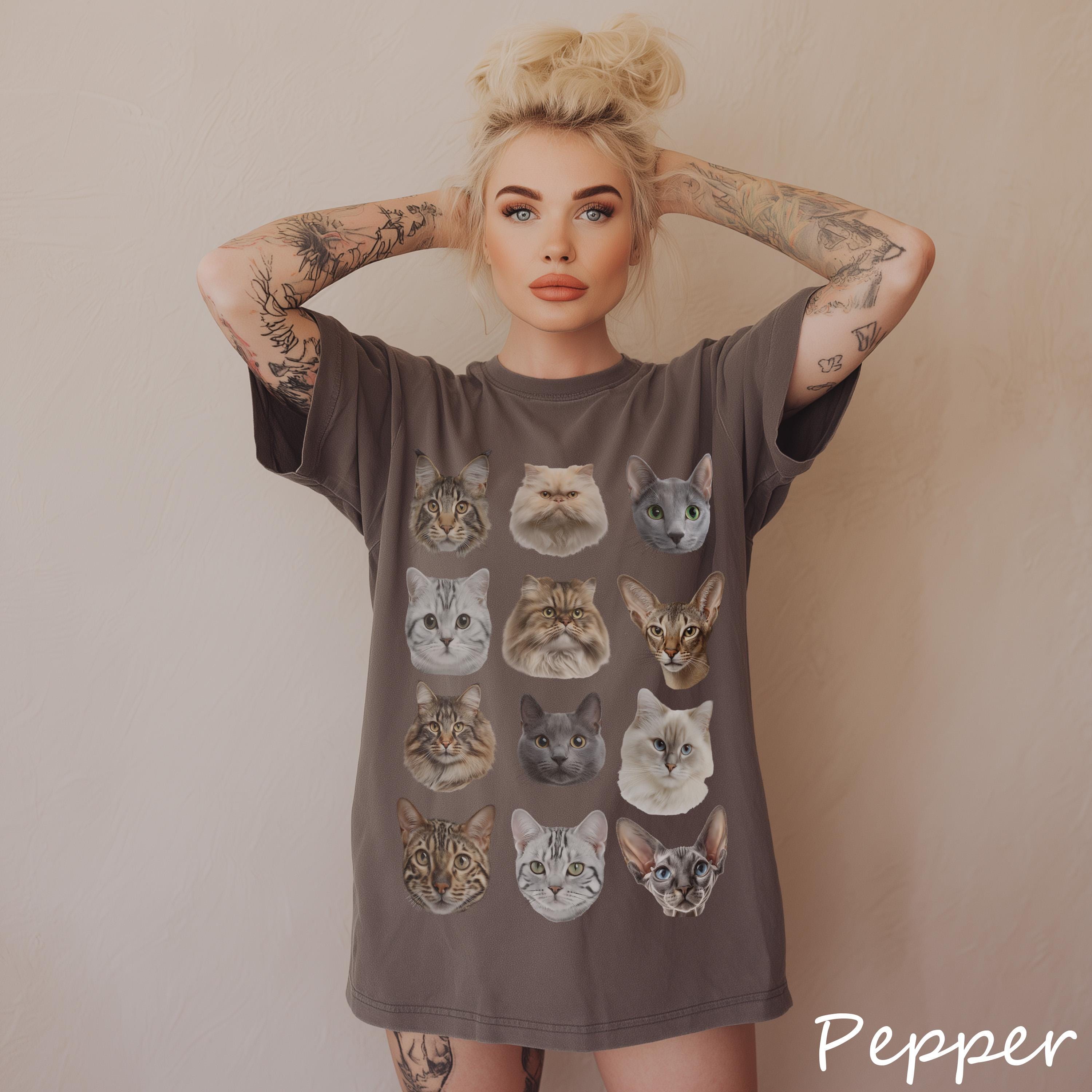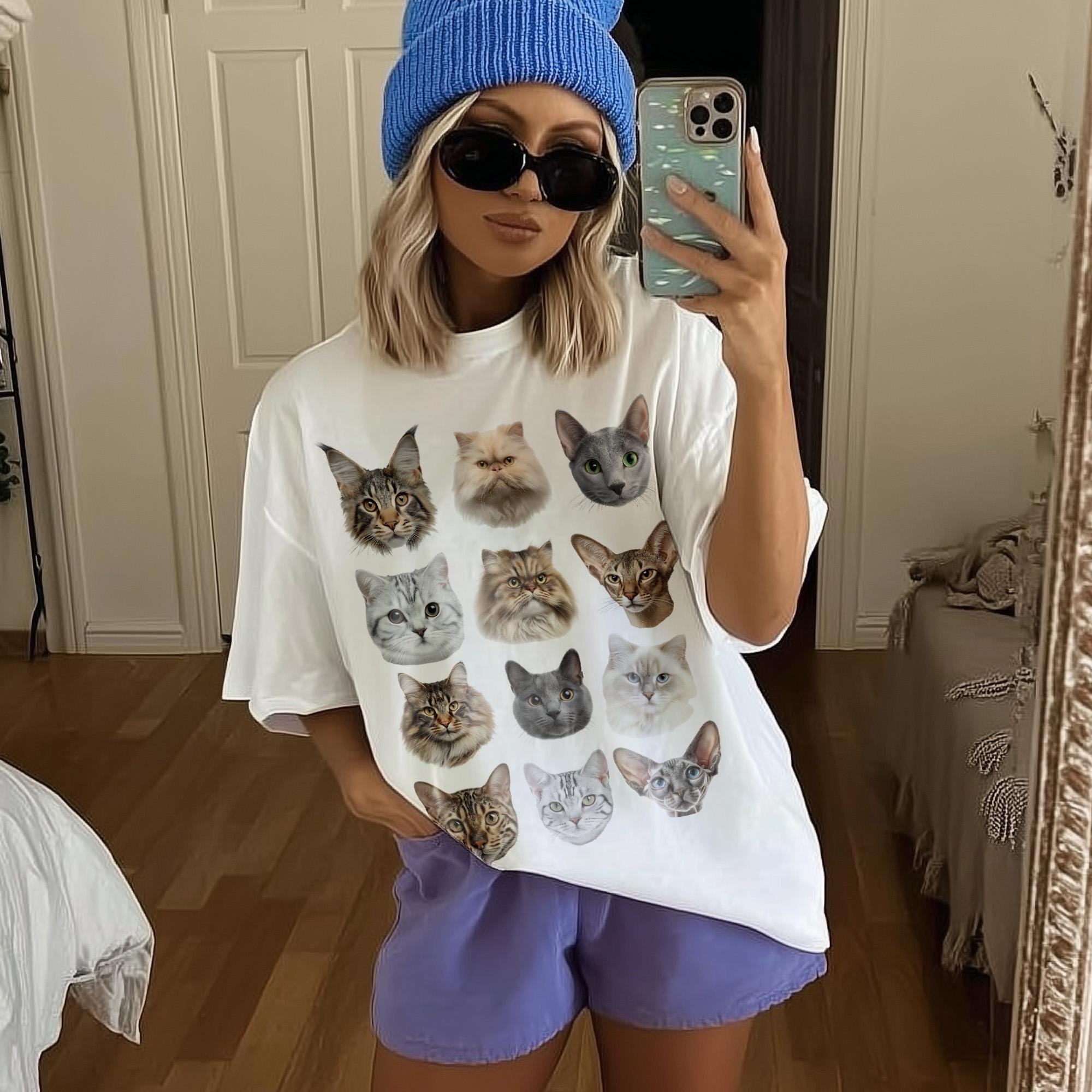 Calling all cat lovers! This dreamy vintage-inspired cat t-shirt is the ultimate cozy statement piece for anyone obsessed with their feline friends. Featuring a grid of adorable and realistic cat faces printed on a soft, high-quality tee, it's the purr-fect blend of nostalgia and style.