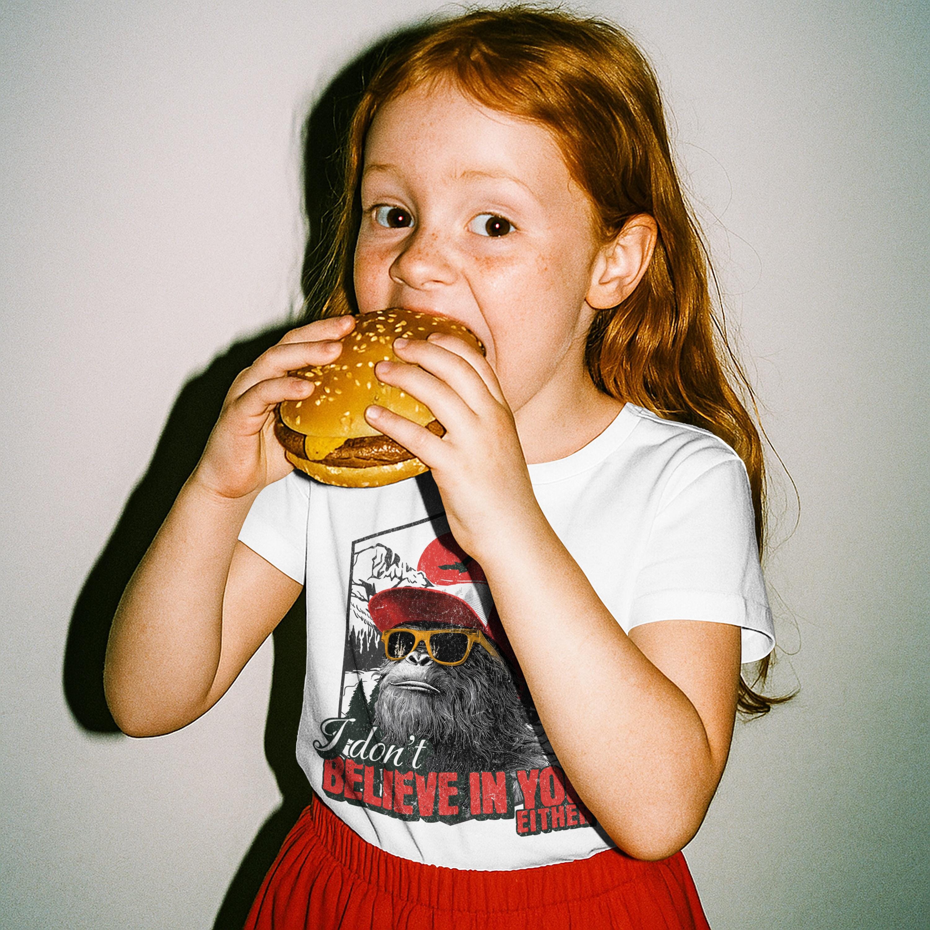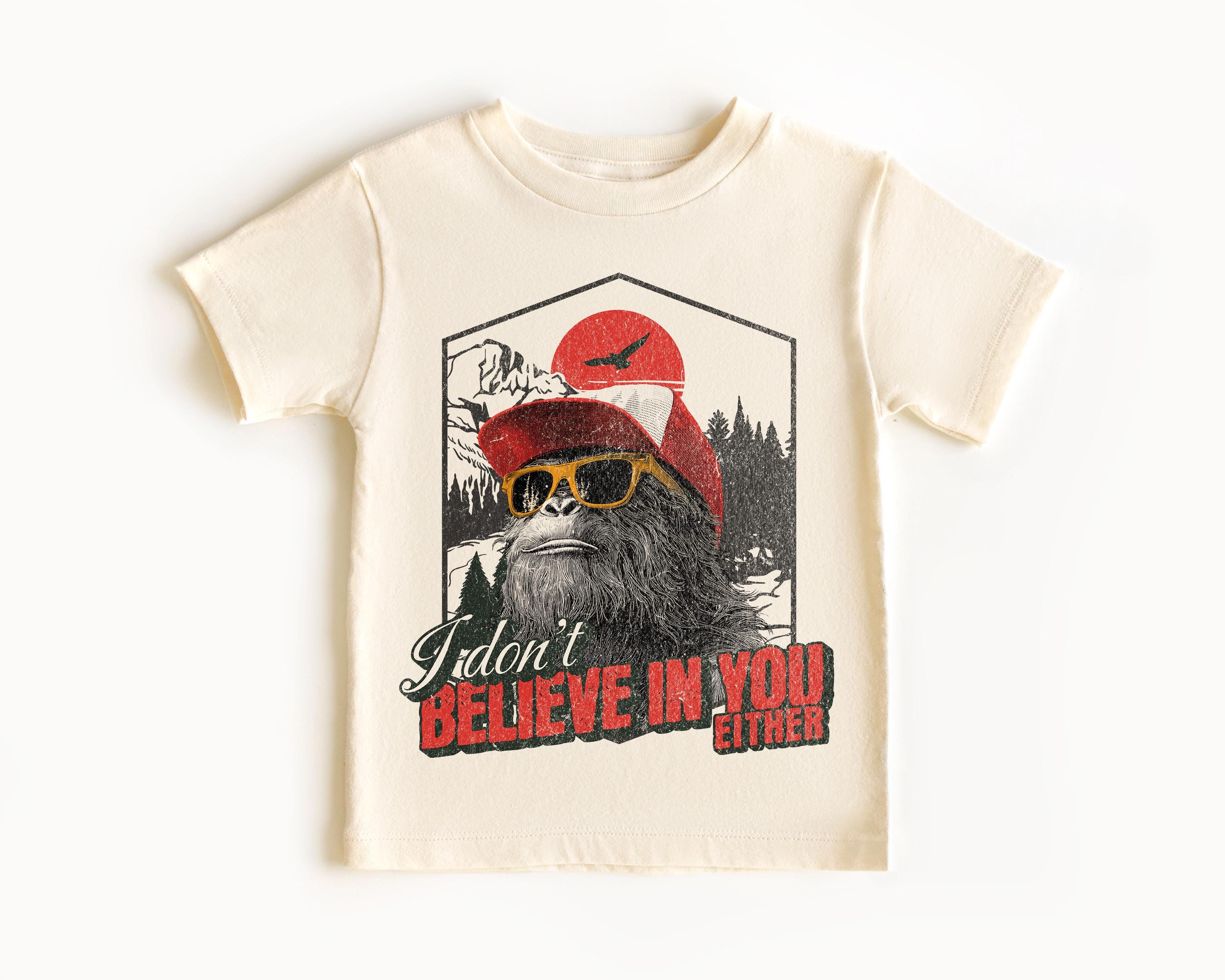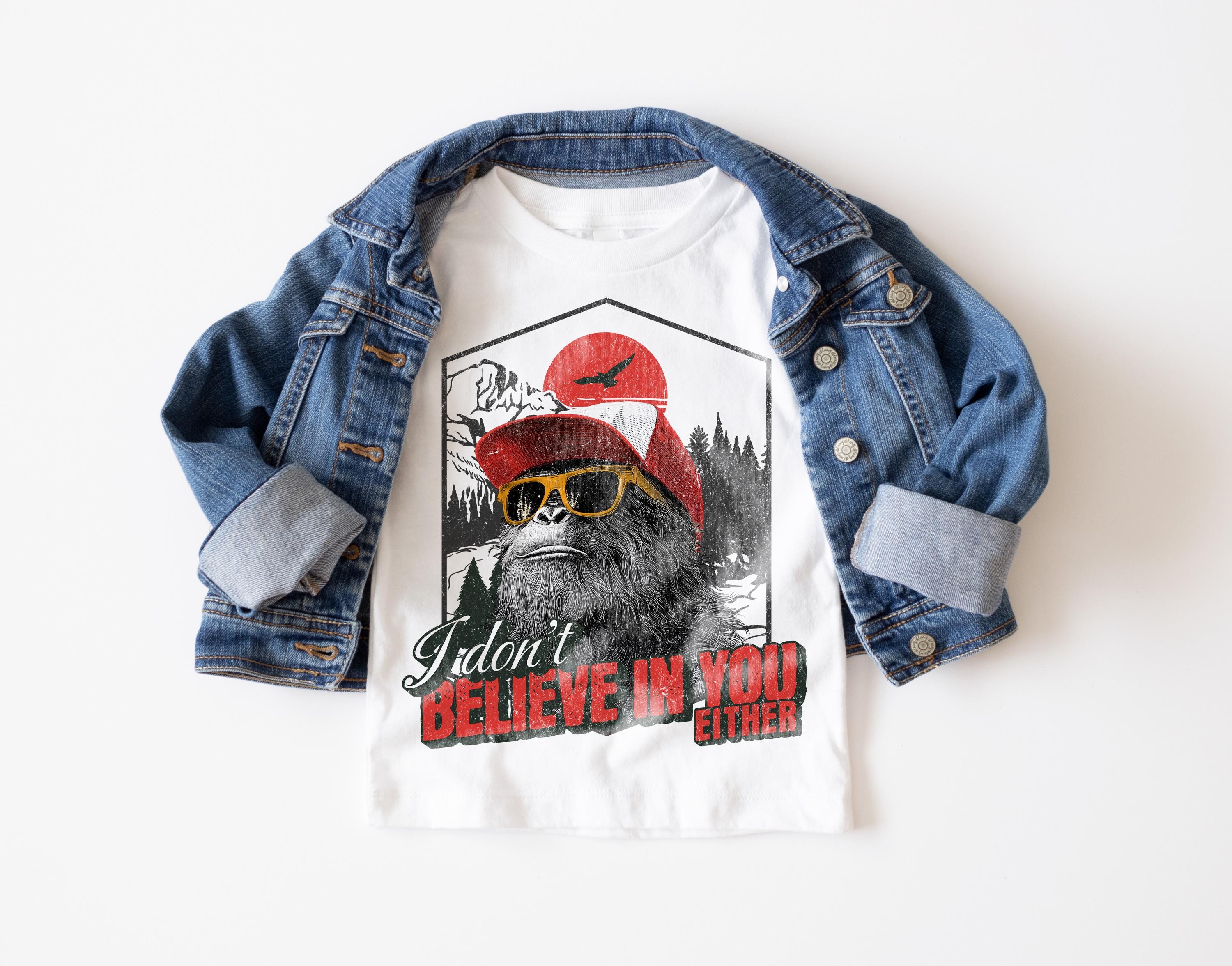 Bring some humor to your toddler’s wardrobe with this playful Bigfoot graphic tee! Featuring the funny phrase “I don’t believe in you either” and a cool Bigfoot rocking a backwards trucker hat and shades, this shirt is perfect for little ones with big personalities.