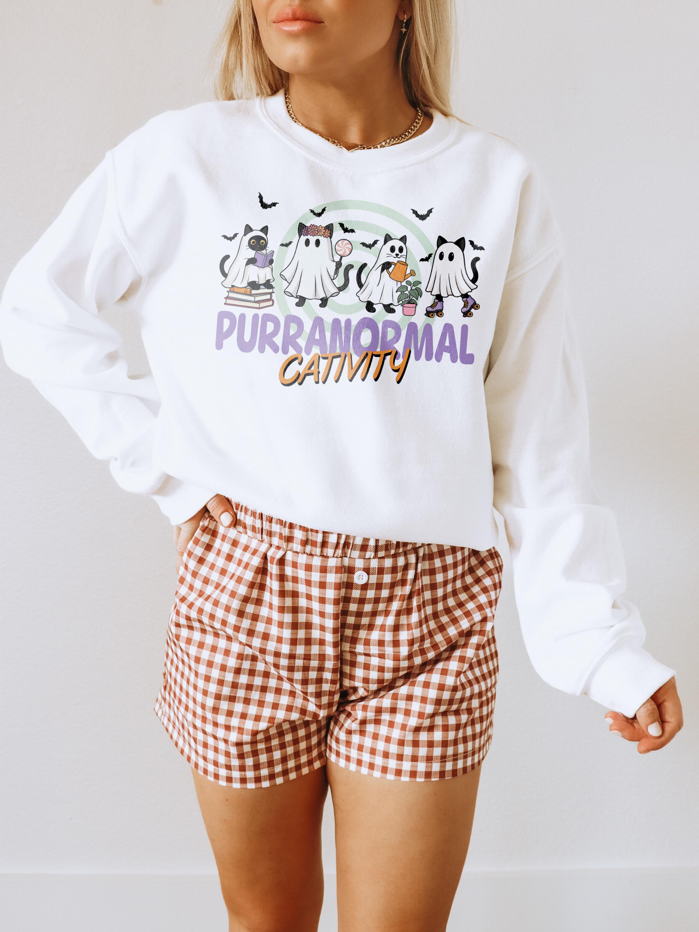 Purranormal Cativity Ghost Cat T-Shirt - Funny Halloween Cat Graphic Tee - Spooky Cute Retro Style Cat Shirt - Halloween Gift for Cat lovers